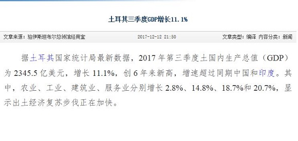 据土耳其国家统计局最新数据,2017年第三季度土国内生产总值(GDP)为2345.5亿美元,增长11.1%,创6年来新高,增速超过同期中国和印度。