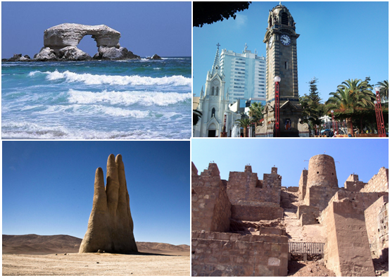 安托法加斯塔是智利北部神秘的阿塔卡马沙漠中的一座矿产城市,往这座北部之城南行70-80公里,就是雄伟的“沙漠之中雕塑”了,雕像高约十米,远远看去,犹如一个巨人被沙漠埋葬后伸出的绝望的手。然而,大家却可以在这座沙漠之城中欣赏到广阔的太平洋海景,“太平洋之门”也是这座城市北部海岸的一处特色景点。安托法加斯塔的市中心是繁华的科隆广场,广场的中央矗立着一座古色古香的钟楼,与周围现代化的建筑形成了鲜明的对比。安托法加斯塔的南部是著名的“查卡遗址”,查卡遗迹距今已有一百多年的历史,它是一座被废弃了的古老冶银厂,因为其建筑工艺只独特以及曾拥有过辉煌的历史,这座厂被完整的保留下来,如今也已是安托法加斯塔城内的一处经典的景色。