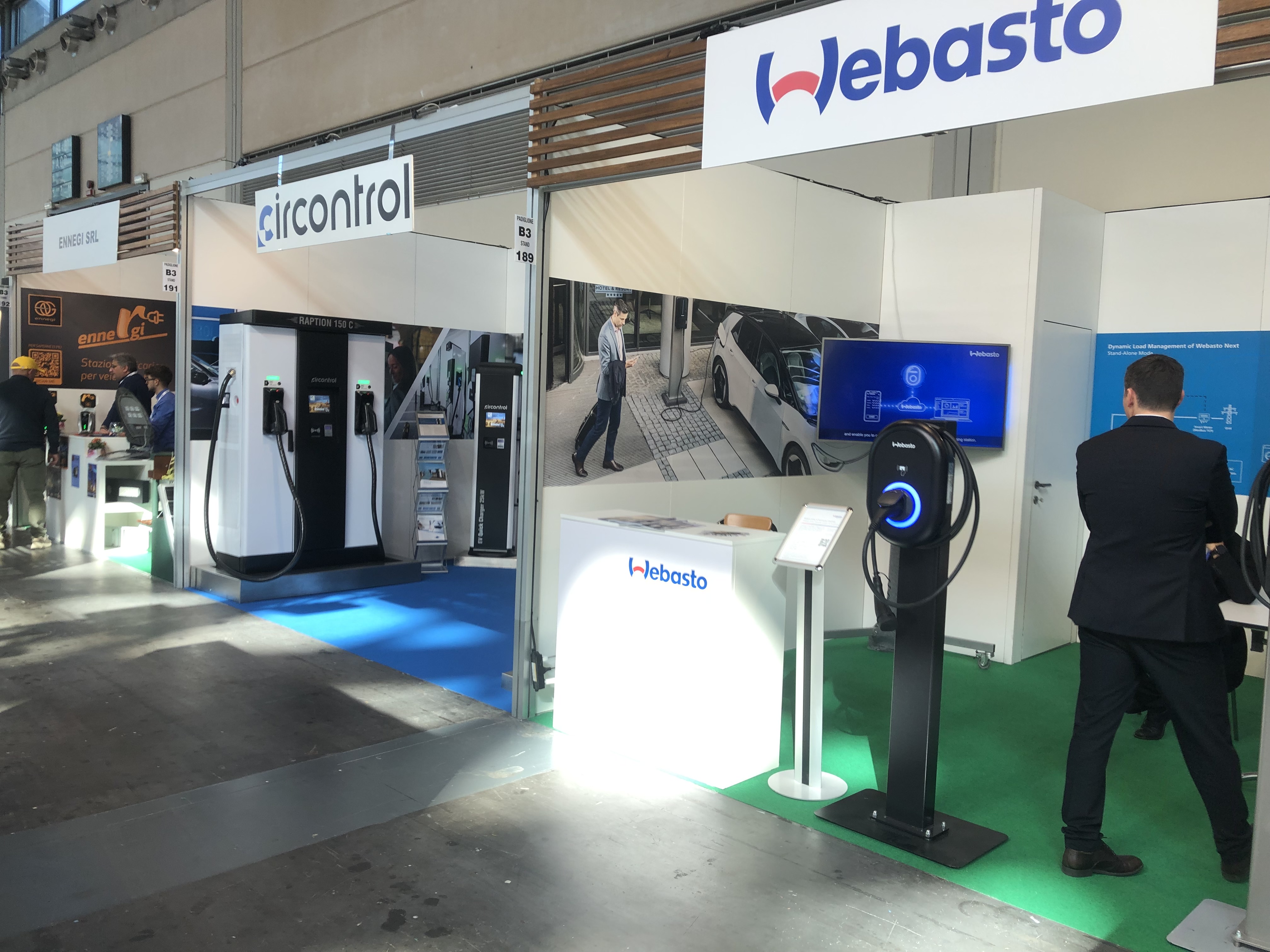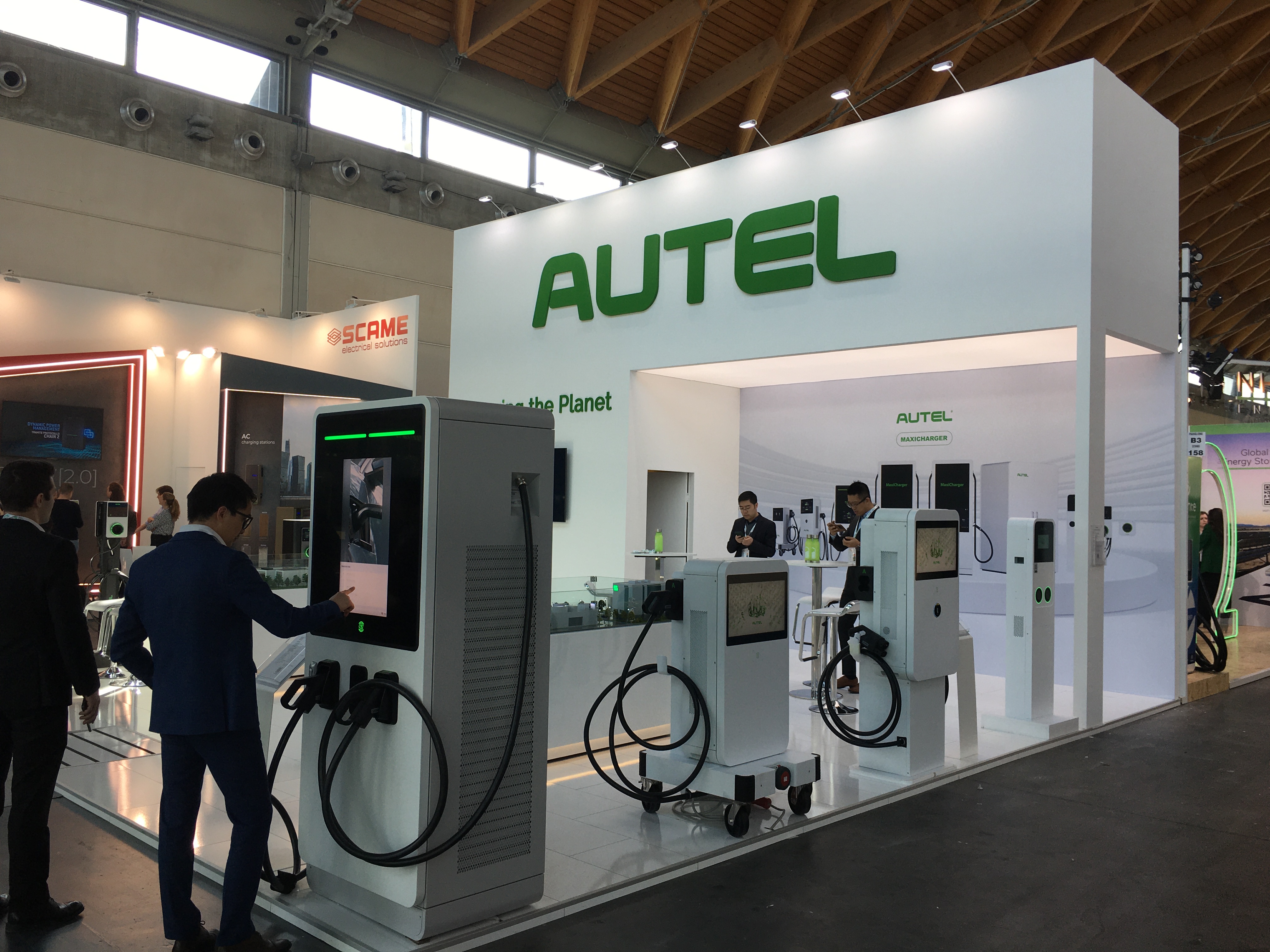 B1-B4为充电桩馆,现场各大参展企业展位人头攒动。西门子,LG ,ABB,深圳道通,欧洲alpitronic 等国际知名充电桩品牌都拿出最新的组合技术。现场有单一充电枪,组合储能移动式充电桩,和路灯结合的充电桩,为卡车充电的大型设备,也有小到为电动滑板充电的设备。这